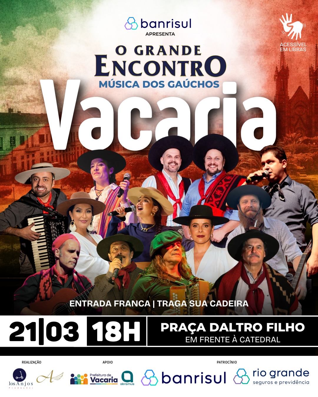 Vai ter “O Grande Encontro – Músicas dos Gaúchos” em Vacaria nesse sábado, 21. Show acontece na Praça Daltro Filho, a partir das 18h. A entrada é gratuita, então já marca quem vai contigo.